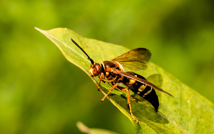 Those fearful of the Asian giant hornet may also get jumpy around a wasp known as the cicada killer. That's a scary-sounding name, plus they can reach 2 inches long. But they are actually gentle giants and play an important role in our ecosystems. Cicadas, in some years, emerge in truly ridiculous numbers, and feed by piercing and sucking up sap from trees and other plants. Cicada killers are one of the many animals that prey on them, stopping the cicada population from getting so large that it destroys trees.