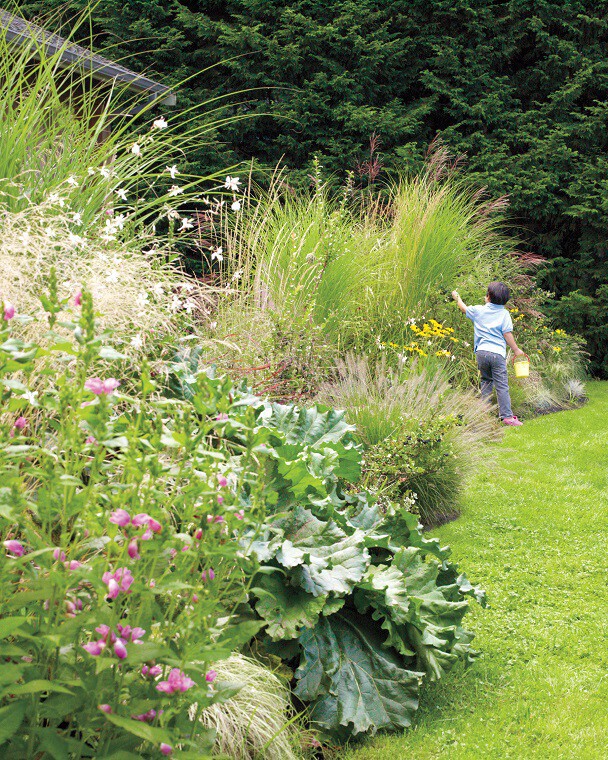 With so many varieties of ornamental grasses to choose from, small to medium sized grasses-such as needle grasses (Stipa ssp.) or sedges (Carex spp.)-can be mixed with perennials and annuals for a dramatic or naturalistic feel. Also, most ornamental grasses can be blended into different garden themes like cottage, seaside, Asian, modern, and even drought tolerant. Pro tip: Before purchasing your grass, read the plant label carefully to determine if your choice needs little or lots of water, as well as what sort of exposure it prefers.